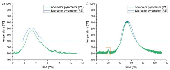 Figure 10 shows characteristic signals obtained by the setup above. Measurements resulting in a smaller melt pool showed increased deviation between the one- and two-color pyrometers (for example, see Figure 10a). This can be explained by the fact that the measured area is bigger than the melt pool, resulting in a reduced signal. Bigger melt pools exhibit a smaller deviation (for example, see Figure 10b).