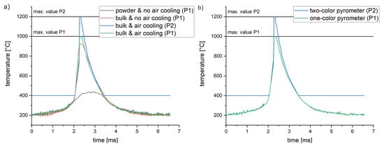 The resulting temperature curves in Figure 11a show a strong impact on the by-products resulting from condition one (by-products caused by the powder layer). In addition, the use of additional air cooling of the optical units increases the maximum temperature. Using both optimized measurement conditions (no visible by-products and additional air cooling), the maximum temperatures of P1 and P2 are reached. Above 500 °C, Figure 11b also illustrates a small mismatch between the signals of P1 and P2. This deviation increases with the temperature and could be due to an increasing emissivity, as shown in Section 3.
