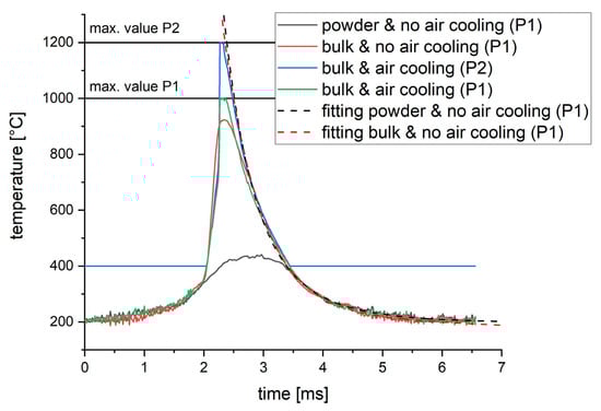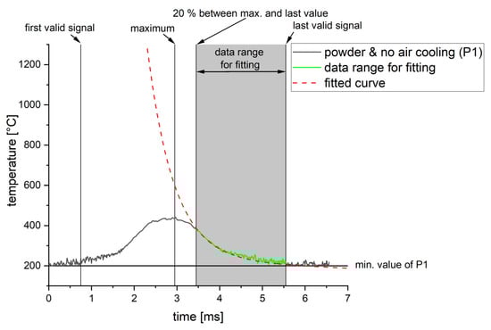When fitting this function to the data obtained by condition one (powder layer and no air cooling) and two (bulk material and no air cooling) within the range defined in Figure 12, the fitting curves in Figure 13 are obtained. Both fitting curves agree with the P2 signal under optimized conditions. The fitting curve for condition one (powder layer and no air cooling) shows no significant deviation. Therefore, the impact of a 30 µm thick powder layer on the cooling rate seems neglectable for the investigated parameter combinations. The presented approach is therefore used in all the following results.