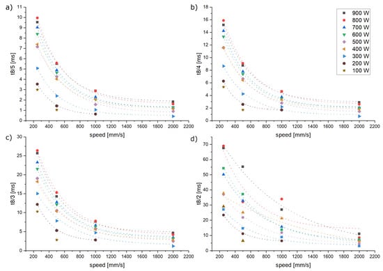 The fact that the cooling rate [°C/s] presents a current value constantly changing over time (see different definitions of literature values in state of the art) makes it a rather unhandy parameter in order to predict microstructural evolutions. Therefore, the cooling duration between the austenitization temperature of around ~800 °C and typical values for the phase transformation to martensite and bainite are calculated based on the fitted curves. The resulting cooling duration between 800 °C and 500 °C (t8/5), 400 °C (t8/4), 300 °C (t8/3), as well as 200 °C (t8/2) are summarized in Figure 14. Cooling durations between ca. 0.5 and 70 ms are observed. The scanning speed has an exponential impact, while the laser power shows a linear effect on the cooling duration. Based on the coefficient of determination R2 obtained by linear regressions, the linear correlation is especially significant for slower exposure speeds. At 2000 mm/s R2 between 0.31 and 0.76, at 1000 mm/s R2 between 0.62 and 0.92, at 500 mm/s R2 between 0.86 and 0.93 and at 250 mm/s R2 between 0.89 and 0.98 were observed. The reason for this could be unstable melt pools (balling phenomena) which occur and have been observed at higher exposure speeds. This would result in increased deviations within the measurements. Furthermore, the linear (impact of laser power) as well as the exponential regression (impact of exposure speed) show a higher significance for the cooling duration t8/5, t8/4 and t8/3 for t8/2. This could be due to the imprecision of the fitting process.