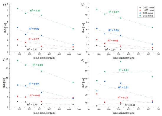 Impact of the focus diameter on the cooling durations. (a) 800 °C to 500 °C. (b) 800 °C to 400 °C. (c) 800 °C to 300 °C. (d) 800 °C to 200 °C.