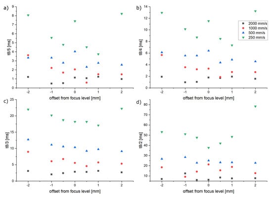 Impact of the focus level offset on the cooling durations. (a) 800 °C to 500 °C. (b) 800 °C to 400 °C. (c) 800 °C to 300 °C. (d) 800 °C to 200 °C.