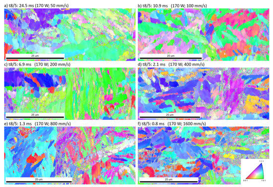 EBSD measurements at non-heat-treated single laser tracks (laser tracks within the last process layer). The cooling duration t8/5 is varied by increasing exposure speeds and a constant laser power of 170 W. (a) 24.5 ms (50 mm/s); (b) 10.9 ms (100 mm/s); (c) 6.9 ms (200 mm/s); (d) 2.1 ms (400 mm/s); (e) 1.3 ms (800 mm/s); (f) 0.8 ms (1600 mm/s).