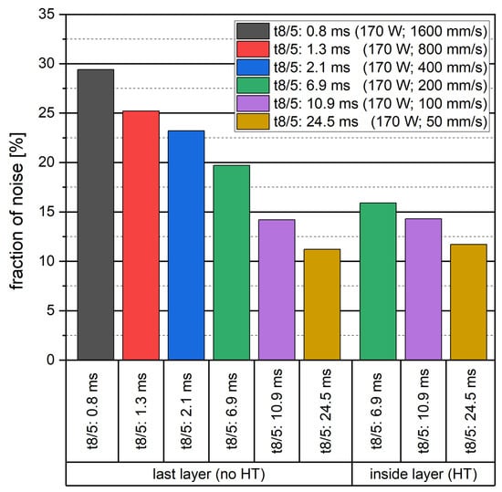 When comparing the fraction of noise within the single laser tracks, a clear decreasing trend with increasing cooling duration is visible. Figure 18 shows the correlation between the cooling duration t8/5 and the resulting ratio of noise. This trend is in accordance with the assumption of microstructures resulting from severe deformations or amorphous areas. While the in-situ heat treatment of the laser tracks does not show any significant effect on the fraction of noise regarding slower cooling durations of 24.5 ms and 10.9 ms, the laser track resulting from a cooling duration of 6.9 ms shows a significant decrease in noise. This could be due to annealing effects.