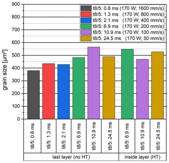 It is well known that the grain size within a microstructure will increase with the cooling duration. Therefore, Figure 19 presents the average grain size in µm2 for the investigated cooling durations. The results show a tendency to increase grain sizes. The in-situ heat treatment does not show any significant impact on the grain size.