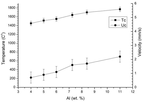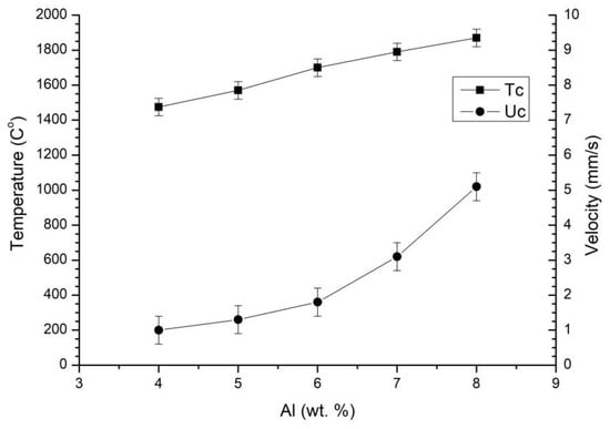 The dependence of the combustion temperature Tc and combustion front propagation velocity Uc on the aluminum content (wt.%) involved in the oxidation reaction.