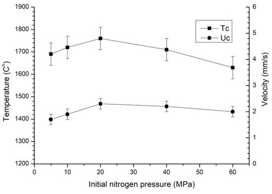 These findings suggest that a pressure of 20 MPa is enough for the nitriding process of these mixtures, and further increasing the nitrogen pressure is not necessary. However, higher nitrogen pressures lead to increased heat losses from the combustion front due to the higher heat conductivity of the atmosphere, which ultimately results in diminishing combustion velocities Uc.