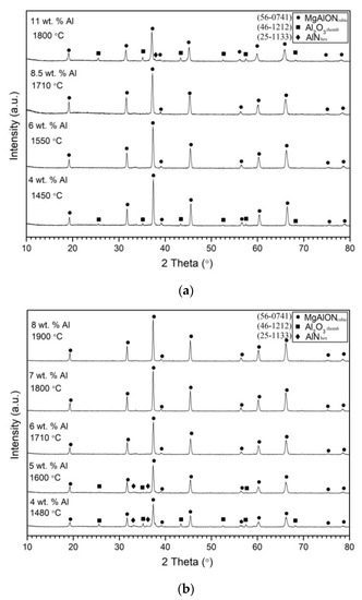 Starting compositions (mole fractions) for the synthesis of MgAlON from selected literature sources [12,16,31,32,33,34] (a) and starting compositions (mole fractions) for the synthesis of MgAlON used in this work (b).