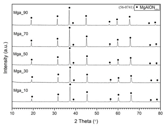 Therefore, our primary objective was to investigate the individual effects of oxidation and nitriding reactions on the combustion temperature to gain precise control over the process. This would allow us to obtain single-phase MgAlON powders of any composition, ranging from pure AlON to pure MgAl2O4 spinel, while maintaining the same grain size. We designated the resulting mixtures as Mga10, Mga20, Mga30, etc., where the number signifies the calculated weight percent of the spinel in the AlON/spinel solid solution.