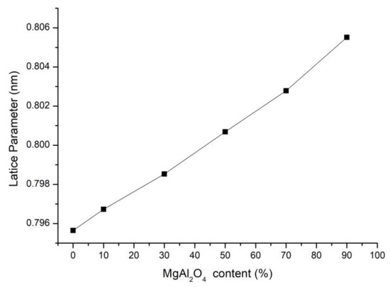 The dependence of the MgAlON lattice parameter on the MgAl2O4 content.