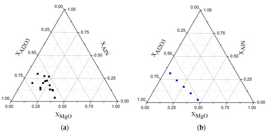 Lastly, Figure 11 displays the starting compositions (mole fractions) for the synthesis of MgAlON from selected literature sources [12,16,31,32,33,34] (a) and the starting compositions (mole fractions) for the synthesis of MgAlON used in this work (b), shown in a simplified diagram of the ternary MgO-AlN-Al2O3 system.