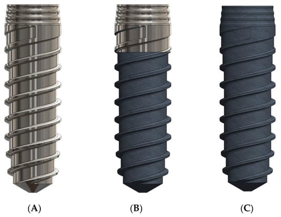 (A). Smooth dental implant (L). (B). Hybrid dental implant (H). (C). Rough dental implant (R).
