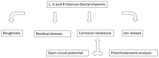 The corrosion simulated in vitro with fluids and environments similar to those exposed in the oral environment has been demonstrated in different studies, and in them, the appearance of titanium ions depends on pH, the time of immersion in the fluid, and the type of acid [26]. This process is known as biocorrosion. The concept of biocorrosion can be extended if mechanical factors produced by the load or friction between the different elements of the implant–prosthesis complex are taken into account. This type of corrosion is known as tribocorrosion [27,28,29].
