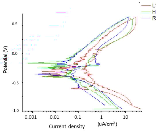 The results obtained by performing the anodic polarization potentiodynamic tests are presented, in which the corrosion potential (ECORR) and corrosion intensity (iCORR) were determined from the polarization curves. The graph in Figure 4 shows three representative potentiodynamic corrosion curves for the three types of samples evaluated.