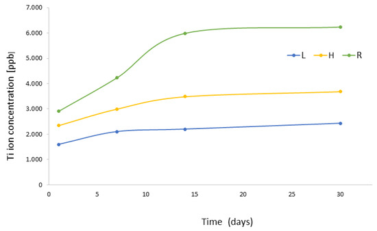 The results of ion release show higher values at all tested times, indicating that rough dental implants have a larger specific surface area than hybrid dental implants and even larger than smooth dental implants. For this reason, the values of titanium ions released into the medium are higher. However, it should be noted that the values are very small, parts per billion, and therefore there does not seem to be any toxicity problem. It is important to distinguish chemical degradation by corrosion, which is a chemical reaction, from degradation by ion release, which is a solution of metal ions to the medium [55,56].
