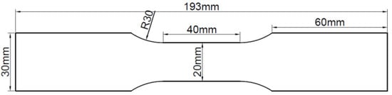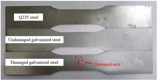 The specimens utilized in the test were fabricated from Q235 steel plate and hot-dip galvanized steel plate using a CNC wire cutting machine. The size of each test piece was designed according to ISO 6892-1 [19], as illustrated in Figure 1. Prior to use, the specimens were degreased with acetone and kept in an oven. The chemical composition of the steel plate specimens was analyzed by a Spectro spark direct reading spectrometer (SPECTRO MAX, SPECTRO Analytical Instruments GmbH, Kleve, Germany) to determine the mass fraction of the main alloy elements, which for the Q235 steel had the following chemical composition (mass fraction, %): C 0.18, Si 0.25, Mn 0.5, P 0.018, S 0.016, Fe balance. The galvanized steel specimens were manufactured by hot-dip plating in accordance with ISO 1460 [20]. Based on the manufacturer’s data, the zinc layer thickness of galvanized steel was 50 μm, which adhered to ISO 1461 [21]. The thickness of the Q235 steel specimen was 0.95 ± 0.01 mm, and that of the galvanized steel specimen was 1.16 ± 0.01 mm. The experimental specimens were categorized into three groups: (1) Q235 carbon steel, (2) undamaged galvanized steel, and (3) damaged galvanized steel. The damaged galvanized steel was produced using the undamaged galvanized steel as the prototype. To create a 10 mm-long gap in the center of one side of the undamaged galvanized steel and destroy the zinc layer, a surface scratch test needle was used to make a damaged notch with a width of approximately 1 mm and a depth of approximately 0.1 mm. The damaged area was less than 0.2% of the total area of the galvanized steel specimen, rendering it negligible. Therefore, the specific specification requirements for scratches on damaged galvanized steel specimens do not have to be too precise. The actual images of the three specimens are displayed in Figure 2.