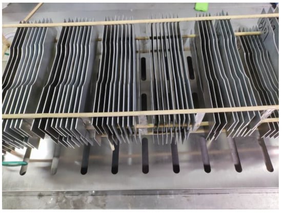 Some studies have shown that the corrosion rate of galvanized steel in solution increases significantly when the temperature exceeds 60 °C [22,23]. Compared with the marine atmospheric environment and industrial atmospheric environment, since this study simulates a rural atmospheric environment, the concentration of Cl− and SO2 in the environment is lower, so the corrosion rate of the specimens is slower. In order to accelerate the corrosion process of the specimens, the temperatures of 50 °C, 70 °C, and 90 °C were simulated in a damp heat test chamber (KZ-TH-80B, Dongguan Ke Zheng Instrument Co., Ltd., Dongguan, China), distilled water was used as the test solution, and the relative humidity was 95%. Legault and Pearson found that the sky-facing surface of galvanized steel specimens corroded faster than the ground-facing surface [24]. Therefore, to avoid the galvanized steel with a broken notch on only one side being affected by the above reasons, all specimens were placed on custom-made supports perpendicular to the horizontal plane, as shown in Figure 3. Before the experiment, epoxy resin was used to protect the cutting edges of the specimens to prevent edge corrosion. The experiment involved taking out a batch of specimens every 15 days, with a continuous testing period of 5 months.
