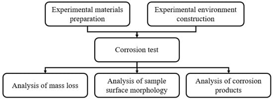 Take each specimen in the test chamber to photograph the macroscopic corrosion morphology of the specimen, and then take the center of the specimen cut into 5 mm × 5 mm specimens, using a scanning electron microscope (TESCAN VEGA 3 XMU, TESCAN ORSAY HOLDING, a.s, Brno, Czech Republic) to observe the microscopic morphology of corrosion products on the surface of the specimen. An X-ray diffractometer (D8 ADVANCE A25, Bruker, Billerica, MA, USA) was used to identify the corrosion product composition (Cu target with a voltage of 40 kV and a current of 40 mA), and diffraction angle 2θ was scanned from 10° to 80° at a scan rate of 0.15°/s. All experimental steps are shown in Figure 4.