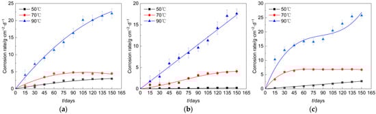 The increase in temperature often causes the intensification of corrosion on the specimen and produces more oxidation products faster. The dense oxidation products will slow down the further corrosion of the specimens, similar to the behavior of these specimens at 70 °C [16,17]. However, compared to the conditions of 50 °C and 70 °C, the corrosion rate of all specimens in the 90 °C case increased significantly and did not show a slowing trend. We believed this was due to the fact that the corrosion products generated at 90 °C in the specimens did not effectively protect the base metal. Although the corrosion rate of the galvanized steel material was slightly stable from day 60 to day 90 of the test, the zinc layer did not provide durable protection, allowing the base metal to be heavily involved in the corrosion reaction process.