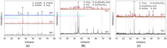 - The specimens of each type on the 60th day of the test were selected for chemical analysis of corrosion products. Since the corrosion products of damaged and undamaged galvanized steel were extremely small at 50 °C, no specimens were taken for these two types of specimens. Figure 6 shows the XRD physical phase analysis of the surface corrosion products of the three types of specimens after corrosion at different temperatures. It can be seen that the composition of the surface corrosion products of galvanized steel was slightly different at different temperatures, especially for galvanized steel as a material. At 70 °C, the peak intensities of ZnO and Zn(OH)2 in the corrosion products of undamaged galvanized steel are relatively high, and there are also lower peak intensities of Zn5(OH)6(CO3)2 and Zn4(OH)6SO4 xH2O. However, at 90 °C, the peak intensity of ZnO in the corrosion products drops sharply, while that of Fe3O4 increases significantly. Based on this phenomenon, we conclude that at 90 °C, the base metal of galvanized steel is already undergoing corrosion. For damaged galvanized steel, there are oxidation products of both iron and zinc due to the destruction of the galvanized layer. Its corrosion products were mainly Fe3O4, ZnO, and Zn(OH)2, accompanied by Zn4(OH)6SO4 xH2O and Zn5(OH)6(CO3)2. As the temperature increased, the intensity of the peaks corresponding to the corrosion products ZnO and Zn(OH)2 gradually became more and more obvious, indicating that the increase in temperature also caused the zinc in other undamaged regions to participate more actively in the oxidation reaction. The corrosion products of Q235 steel were mainly Fe3O4, αFeOOH, βFeOOH, and γFeOOH, and their peak intensity increased to varying degrees with the increase in temperature.