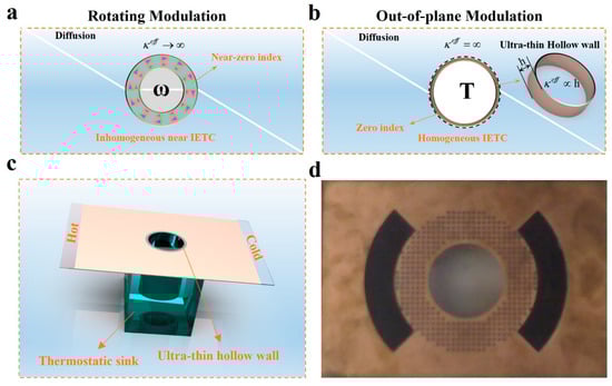 In photonics, when the value of either permittivity ε or permeability μ is zero (known as zero-index media); the Helmholtz equation, , degenerates to a Laplacian equation, , where ω and E are the angular frequency and the electric field, respectively. Such zero-index metamaterials have induced considerable interesting phenomena, and, simultaneously, the inhomogeneous issue in optical zero-index media usually exists, resulting in the further applications of these zero-index metamaterials [24,25,26,27,28,29,30,31]. Similarly, in heat diffusion, the Fourier-transformed heat conduction equation, , also degenerates to a Laplacian equation when the thermal conductivity approaches IETC, where ρ, cp, and T are the density, heat capacity, and temperature, respectively. In diffusion, an IETC, related to the optical zero-index concept, can be realized through different strategies as shown in Figure 1. Herein, the traditional inhomogeneous near-zero-index scheme was realized by highly rotating the on-demand region (Figure 1a) [15]. Similarly, the out-of-plane modulation scheme (Figure 1b), in principle, can introduce a homogeneous IETC, indicating a more flexible way to obtain a homogeneous IETC. Thus, the homogeneous IETC can be introduced in practice and can be rendered an equivalence of the zero index in photonics. Additionally, we could also realize a continuous tunable ETC (TETC) via the height change of the ultra-thin hollow wall in the central part. Finally, a homogeneous IETC and TETC could be achieved by combining a thermostatic sink and the ultra-thin hollow wall together for diverse thermal applications (Figure 1c), and, furthermore, the real photo of the proposed metadevice is shown in Figure 1d.