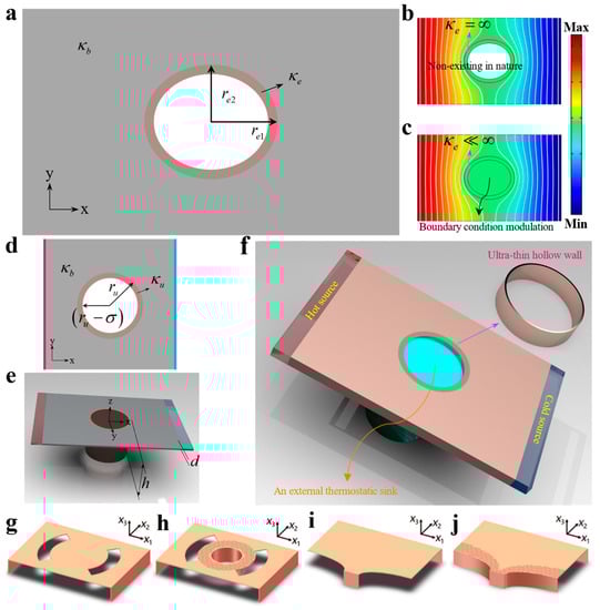 Thus, when the actual thermal conductivity of the 2D ultra-thin elliptical hollow structure was infinite, it was easy to see that Te always approached a constant temperature C as shown in Figure 2b. However, the actual thermal conductivities of naturally occurring materials are usually smaller than 400 W m−1 K−1 [10]. For physicists, if the ETC is infinite, the heat flux will not diverge, and it can realize a constant temperature distribution. In other words, a homogeneous IETC can be obtained when any object is in contact with a constant temperature boundary condition as shown in Figure 2c.