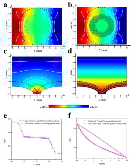 Simulations of zero-index thermal camouflage and super thermal expander. (a) Equivalent object corresponding to Figure 2g. (b) Homogeneous zero-index thermal camouflage device corresponding to Figure 2h. (c) Traditional thermal expander corresponding to Figure 2i. (d) Homogeneous zero-index super thermal expander device corresponding to Figure 2j. Isothermal lines are represented in white color on the panel. The highest and lowest temperatures were 308 K and 283 K, respectively. (e) The simulated temperature profiles of the equivalent expected objects and homogeneous zero-index thermal camouflage at the line y = 0 mm. (f) The simulated temperature profiles of the traditional thermal expander and homogeneous zero-index super thermal expander at the line x = 0 mm.