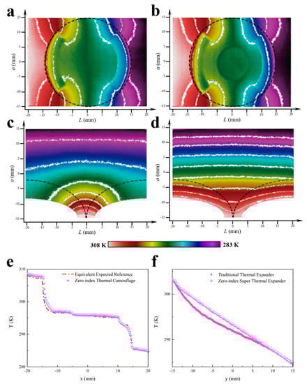 Experimental measurements of temperature profiles of various thermal metadevices. (a) Results for the equivalent expected objects in Figure 2g. (b) Results for the homogeneous zero-index thermal camouflage device in Figure 2h. (c) Results for the traditional thermal expander in Figure 2i. (d) Results for the homogeneous zero-index super thermal expander device in Figure 2j. Isothermal lines are represented in white color on the panel. The highest and lowest temperatures were 308 K and 283 K, respectively. (e) The temperature profiles of the equivalent expected objects and homogeneous zero-index thermal camouflage at the line y = 0 mm. (f) The temperature profiles of the traditional thermal expander and homogeneous zero-index super thermal expander at the line x = 0 mm.