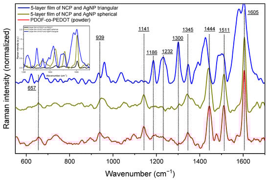 - Stavytska-Barba, M.; Kelley, A.M. Surface-Enhanced Raman Study of the Interaction of PEDOT: PSS with Plasmonically Active Nanoparticles. J. Phys. Chem. C 2010, 114, 6822–6830. [Google Scholar] [CrossRef]