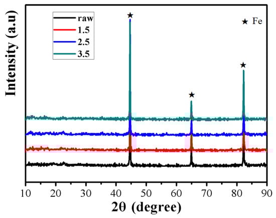 Figure 2 shows the XRD data with sample oxidized at different contents of NH3·H2O (1.5, 2.5, and 3.5 wt%). According to JCPDS Card No. 87-0721, the diffraction peaks at 2θ values of ca. 44.70°, 64.98°, and 82.30° were from the (110), (200) and (211) planes of the α-Fe phase. And unexpectedly, only peaks originating from the raw powders were detected without the observation of any peaks corresponding to the CoFe2O4 phase of the oxidized powders. The reason for this result may be that the amount of CoFe2O4 phase is too low to be detected by XRD.