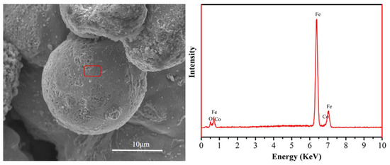 Figure 3 shows the SEM micrograph with EDS results of the oxidized Fe powders. It can be seen that the surface of oxidized iron powder particles in the morphology under SEM is rough, indicating that there is an oxidation layer on the surface. The element of cobalt, iron, and oxygen from corresponding area could be seen obviously. This suggests that a CoFe2O4 layer was formed. Regarding the depth of analysis, a comparison of the strengths of the oxygen and iron peaks indicates that the content of CoFe2O4 is relatively low.