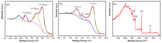 XPS was measured to determine the oxidation states of the insulating layer on the oxidized powders. The XPS patterns of the oxidized Fe powders sputtered for 1000 s by Ar+ cation can be seen in Figure 6. High-resolution XPS spectra of the 2p peaks of Co and Fe are described in Figure 6a,b. The electron binding energy of the Co 2p level was measured: the Co 2p1/2 and 2p3/2 peaks were located at approximately 795.7 eV and 780.2 eV, respectively, along with characteristic shake-up satellite peaks identified at approximately 802.1 eV, and 785.5 eV, confirming the existence of Co2+ species [24]. The XPS Fe 2p spectrum exhibited two peaks corresponding to Fe 2p1/2 and Fe 2p3/2 located at approximately 724.4 eV and 711.1 eV, respectively, with a typical satellite peak at approximately 719.4 eV, which were assigned to Fe in the 3+ oxidation state [25]. The survey spectrum of oxidized powder is shown in Figure 6c, which indicate the existence of cobalt, iron, oxygen, and carbon. The analysis results of the XPS measurements further demonstrated that the insulating layer comprised with CoFe2O4.