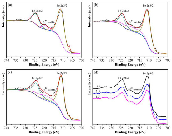 A weak peak at 706.6 eV was observed for the sample oxidized by 1.5 wt% NH3·H2O, which corresponds to the Fe 2p3/2 binding energy in metallic Fe, indicating an incomplete CoFe2O4 insulating layer as shown in Figure 7. During the in situ oxidation process, the nano-CoFe2O4 layer will grow on the surface of the bare Fe. Figure 7d shows that a weak satellite peak at 719.4 eV was observed in the XPS spectrum, which corresponds to Fe3+. It is noteworthy that the intensity of satellite peak increases with the increase of reaction concentration.