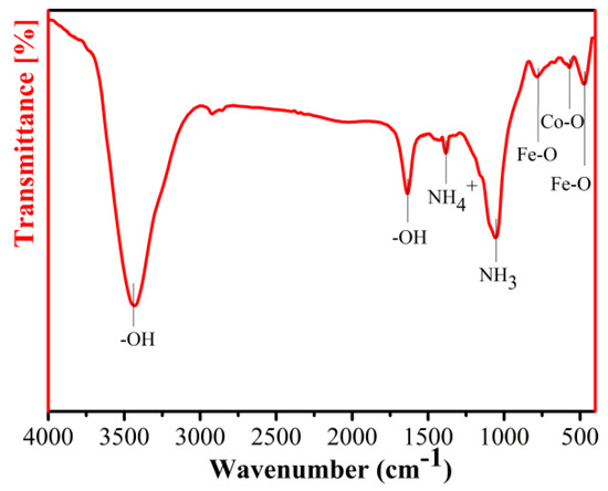 The chemical functional groups of the CoFe2O4/Fe composites were performed by FT-IR spectroscopy in the range 400–4000 cm−1, as shown in Figure 8. The broad absorption bands were observed at 3437, 1637, 1379 and 1058 cm−1 due to the -OH, NH4+ and NH3 vibration, whose peaks are considered to be appeared due to H2O in the air and the adsorbed NH3 on the CoFe2O4/Fe composites [26,27]. From the spectrum, the absorption bands at 779 and 465 cm−1 were assigned to Fe-O stretching. Furthermore, the absorption peak at 572 cm−1 corresponded to the vibration of Co-O [28]. The above results further demonstrated the nano-CoFe2O4 layer was formed on the on the surface of the Fe powder.