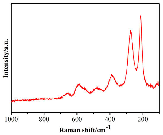 Raman spectroscopy is an important characterization technique for investigating the vibrational motion of molecules. The Raman spectroscopy of the oxidized powder sample was shown in Figure 9. The characteristic peaks in the sample appeared as sharp peaks at 213 and 275 cm−1 and shoulder peaks appeared at 390, 481, 590, and 654 cm−1, which confirmed the formation of a CoFe2O4 cubic spinel ferrite [22]. Since the Raman peaks at approximately 590 cm−1 usually correspond to the nature of the tetrahedra in the spinel, the low-frequency mode of approximately 490 cm−1 is related to an octahedral structure [22].