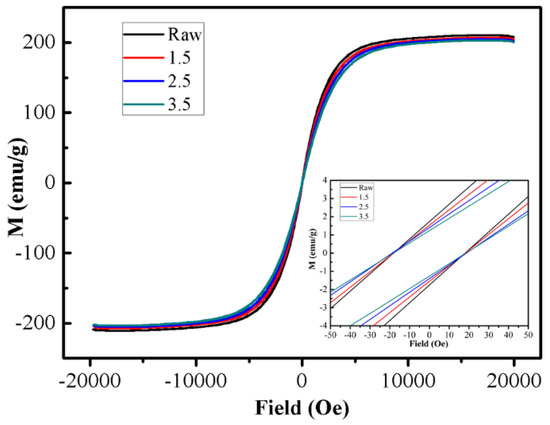 Figure 10 provides the variations of magnetization as a function of an applied magnetic field, as found by measuring samples of the Fe powders and those undergoing different reaction concentrations. The magnetic moment as a function of the magnetic field was measured over a range from −20,000 to 20,000 Oe at 25 °C. The values of saturated magnetization (Ms) were decreased sequentially from 207 to 203 emu/g with increasing ammonia concentration, because of the insulating CoFe2O4 layer with lower Ms [29]. The Ms values of the oxidized Fe powder are consistent with that of the raw powder (210 emu/g). This is attributed to the formation of the ferromagnetic CoFe2O4 coating by the in situ oxidation method for the prevention of magnetic dilution.