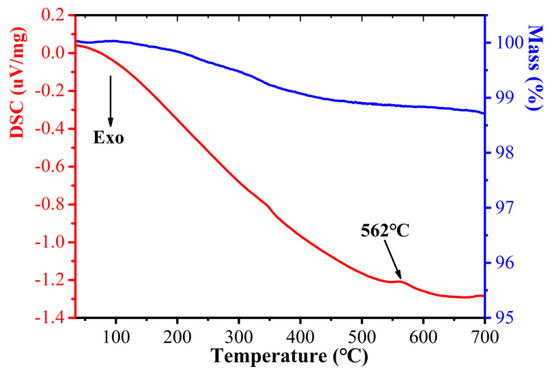 It is necessary to research the thermal stability of CoFe2O4/Fe composites to determine the annealing temperature. The TG-DSC curves were measured for the CoFe2O4/Fe composites powders on the NETZSCH STA 449C, as shown in Figure 11. It can be clearly seen that the mass was decreased at approximately 190 °C due to thermal degradation of the epoxy-modified silicone resin layer, which decomposed slowly with increasing temperature. The DSC curve exhibits an endothermic peak at 562 °C, which indicates that the CoFe2O4 began to decompose, leaving Fe2O3 [30].
