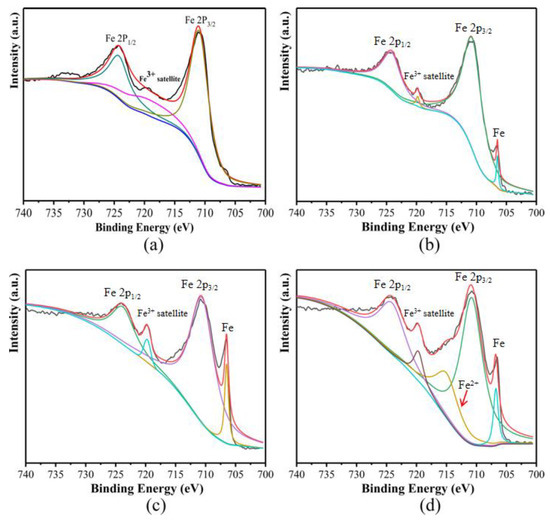 To study the evolution of the CoFe2O4/Fe composites during annealing, Figure 13 shows the XPS spectra taken from the samples after annealing at 500 °C, 550 °C and 600 °C for 1 h. The Fe 2p1/2 and Fe 2p3/2 peaks are located near 724.4 eV and 710.1 eV, respectively, with a more obvious satellite peak near 719.8 eV, indicating that the CoFe2O4 is exposed on the surface, which proves that the silicone resin coating of the samples annealed at 500 °C was partially decomposed. In addition, As shown in Figure 13b, a weak peak was surveyed near 706.5 eV, which corresponds to the Fe 2p3/2 peak of the metallic Fe, indicating that part of CoFe2O4 is reduced to Fe during annealing [25]. Figure 13c shows the samples annealed at 550 °C, the positions of Fe 2p1/2 peak and Fe 2p3/2 peak remain unchanged, but the satellite peak intensity corresponding to Fe3+ near 719.8 eV is significantly higher than the test results at 500 °C, indicating that the silicone resin is further decomposed and more CoFe2O4 is exposed to the particle surface. Moreover, the peak corresponding to metallic Fe near 706.5 eV is more obvious than that at 500 °C, illustrating that the amount of reduced Fe is further increased. For the samples annealed at 600 °C as shown in Figure 13d, the satellite peak of Fe2+ appeared near 715.7 eV indicating that Fe3+ was reduced to Fe2+. However, the peak intensity of metallic Fe at 706.5 eV is lower than that at 550 °C, indicating that the reduced Fe was oxidized. Therefore, it can be inferred that CoFe2O4 was reduced to FeO by Fe when the sample was annealed at 600 °C.