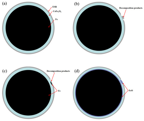 Schematic drawings illustrating the evolution of the CoFe2O4/ESR during annealing, showing (a) Fe powder coated with CoFe2O4/ESR, (b) ESR begins to decompose to form reductive group, (c) The reduced group reacts with CoFe2O4 to form Fe and (d) FeO formed by the reaction of CoFe2O4 with Fe.
