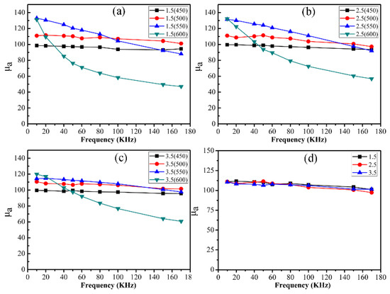 Figure 15 shows the change in amplitude permeability (μa) of measurement frequency for CoFe2O4/Fe composites. The μa of CoFe2O4/Fe composites annealed at 450 and 500 °C exhibited good frequency stability in the range of 10 kHz to 170 kHz. However, when the annealing temperature was 550 °C, the μa of CoFe2O4/Fe composites was decreased slightly with increasing frequency, mainly due to degradation of the organic insulating layer. In particular, when the annealing temperature reached 600 °C, the μa decreased sharply with increasing frequency. This phenomenon can be explained by the influence of the organic and inorganic insulating layers. On the one hand, the further decomposition of the organic layer made the insulating layer incomplete. On the other hand, it is known that the inorganic nano-CoFe2O4 layer decomposed at elevated annealing temperatures, resulting in an incomplete CoFe2O4 insulation coating. In addition, the μa of CoFe2O4/Fe composites reached a maximum value of approximately 110 annealed at 500 °C.