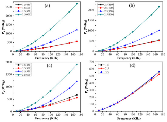 The Ps of the CoFe2O4/Fe composites samples slightly decreased with annealing temperatures ranging from 450 to 500 °C. This mainly resulted from the reduced residual stresses and decreased coercivity caused by the annealing treatment, decreasing the hysteresis loss of Ps. The Ps was increased with the increasing temperature range from 500 to 550 °C, which was mainly caused by the further decomposition of organic coating leading to an increase in the eddy current loss. However, the Ps of the sample annealed at 600 °C sharply increased by 271% compared with the sample annealed at 500 °C. Because the nano-CoFe2O4 insulating layer would be damaged and could not completely coat the surface of Fe powders. The incomplete insulating layer can lead to increased eddy current loss in the CoFe2O4/Fe composites. Moreover, the core loss of the samples oxidized by different ammonia concentrations annealed at 500 °C, as shown in Figure 16d. The core loss exhibited evident decreasing trend depending on increasing ammonia concentration, resulting in a minimum value of 253.6 W/kg recorded at 100 kHz with a mass percentage of 2.5%. At the ammonia concentration of 1.5 wt%, the incomplete CoFe2O4 insulative layer was unable to provide a significant electrical resistivity for the CoFe2O4/Fe composites, giving rise to a large core loss. However, the ammonia concentration was increased to a content of 3.5 wt%, causing the growth of CoFe2O4. This would lead to a large hysteresis loss due to a large coercive force in the CoFe2O4 rather than in the Fe.