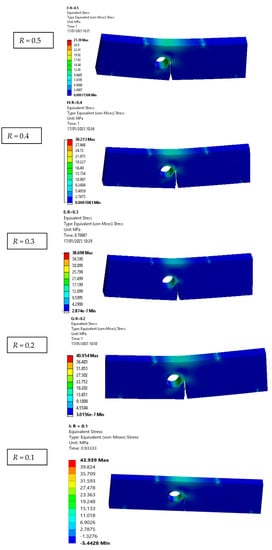 The relationship between fatigue life cycles and stress ratios is an important consideration in the design and analysis of mechanical components that experience cyclic loading. The stress ratio affects the fatigue life of a component because it influences the magnitude and direction of the cyclic loading that the component experiences. When the stress ratio is positive, the minimum stress value during each cycle is greater than zero, meaning that the material experiences a net tensile load during each cycle. Conversely, when the stress ratio is negative, the minimum stress value during each cycle is less than zero, meaning that the material experiences a net compressive load during each cycle. Table 3 displays the fatigue life cycles: Nf for the modified four-point bending specimen under various stress ratios. Figure 9 depicts the fatigue life curves with respect to the crack length for different stress ratios. It is observable that when the stress ratio decreases, the number of cycles decreases. Table 3 and Figure 9 indicate that a component exposed to a positive stress ratio will experience a shorter fatigue life compared to a component exposed to a negative stress ratio. This is due to the fact that a positive stress ratio results in a net tensile load during each cycle, which leads to a faster propagation of fatigue cracks. On the other hand, a negative stress ratio results in a net compressive load during each cycle, causing less damage to the material and resulting in a longer fatigue life. To estimate the distribution of stress and the location of stress concentration, the von Mises stress is considered. Contour plots of von Mises stresses are very useful to give a sense of the stress distribution. Due to a reduction in von Mises stresses, which were evidently depicted in Figure 10, the components’ life increases as the plastic zone’s size enlarges. The data presented in this figure reveal an interesting relationship between the von Mises stress and stress ratio in fatigue crack propagation. Specifically, the figure shows that as stress ratio decreases from 0.5 to −0.5, there is an increase in von Mises stress. Interestingly, these results align with earlier studies that have reported a lack of a significant influence of the stress ratio on crack propagation trajectory under constant amplitude loading [12,47].