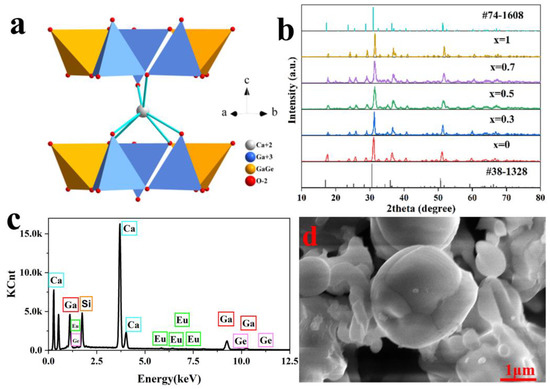 (a) The structure of Ca2Ga2GeO7. (b) XRD patterns of Ca2Ga2(Ge1-xSix)O7:1%Eu2+. (c) EDX for Ca2Ga2(Ge0.5Si0.5)O7:1%Eu2+. (d) SEM image of Ca2Ga2(Ge0.5Si0.5)O7:1%Eu2+.