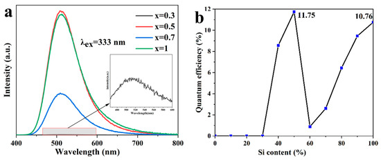 The excitation and emission spectra of Ca2Ga2(Ge1-xSix)O7:y%Eu2+ were measured using the FLS1000 fluorescence spectrophotometer. The emission spectra of Ca2Ga2(Ge1-xSix)O7:1.0%Eu2+ (x = 0.3, 0.5, 0.7, 1) are shown in Figure 2a. All the emission spectra and the excitation spectra of Ca2Ga2(Ge1-xSix)O7:1.0%Eu2+ (x = 0–1) are presented in Figure S2a–c. It is worth noting that both excitation spectra and emission spectra are measured under the same conditions. The excitation spectra were collected in the wavelength range from 250 nm to 450 nm under the 510 nm emission, while the emission spectra were collected in the wavelength range from 400 nm to 800 nm under the 333 nm excitation. Figure 2a shows that when x is at 0.3, there is a very weak peak observed at 510 nm, as shown in the inset. Therefore, the measurement of the excitation spectrum started with the material composition at x = 0.4. All the excitation spectra are characteristic of two broad bands, with one located at 273 nm and another one located at 333 nm. These two observed excitation peaks are attributed to the absorption of Ca2Ga2(Ge1-xSix)O7:1.0%Eu2+ host and the electron transition from the 4f7 ground state (8S7/2) to the 4f65d1 excited state (T2g) of doped Eu2+, respectively [16]. Figure S2a shows significant overlapping of the two broad excitation bands, which facilitates Eu2+ absorbing the energy to increase luminescence efficiency when excited by visible photons. Figure 2a shows that all the emission spectra have a broad band ranging from 430 nm to 730 nm with the highest peak located at 510 nm. The green emission is ascribed to the 4f65d1→4f7 transition of Eu2+ doping in the Ca2+ site [17], which is highly influenced by the crystal field generated due to the electron–electron interaction between the coordination oxygen atoms and the luminous centers. In addition, there are no emission peaks of Eu3+ observed in any of the samples [18,19]. This indicates that Eu3+ ions in the starting material Eu2O3 were completely reduced to Eu2+ by the high-temperature solid-state reaction in the 20%H2-80%Ar atmosphere.