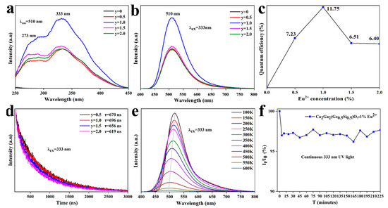 In order to determine the optimal concentration of Eu2+ doped in the material, a series of samples of Ca2Ga2(Ge0.5Si0.5)O7:y%Eu2+ (y = 0, 0.5, 1, 1.5, 2) were prepared in the reducing atmosphere. The excitation and emission spectra of the materials with different Eu2+ contents were measured and are presented in Figure 3a,b, respectively.