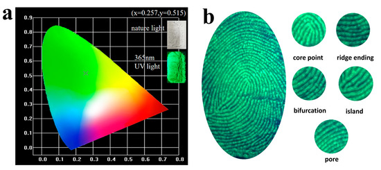 In nature, a living thing that comes into contact with solid matter leaves a trace such as a fingerprint [26]. When a fingerprint touches a glass surface, the phosphor will spread on the glass, and one can see the fingerprint under 365 nm violet light. Figure 4b shows an application of the Ca2Ga2(Ge0.5Si0.5)O7:1.0%Eu2+ material in fingerprint identification. You can clearly see a complete fingerprint and its five fine patterns, which are core point, ridge ending, bifurcation, island and pore. Different types of materials used for fingerprint identification are compared in Table 2 in terms of advantages and disadvantages. In addition, as the green phosphors are more widely used in fingerprint identification than other colors, Ca2Ga2(Ge0.5Si0.5)O7:1.0%Eu2+ exhibits its promise for application in fingerprint identification [27].