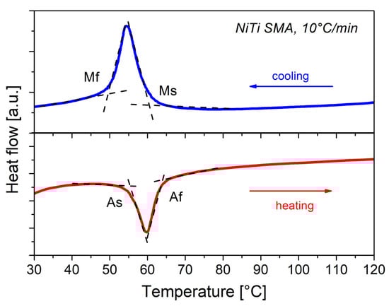 From a practical point of view, it is important to obtain the martensitic transformation temperatures of the SMAs. Figure 3 shows the differential scanning calorimetry (DSC) results, in which the reverse martensitic transformation and the martensitic transformation are observed during the heating–cooling processes. The presence of the R-phase is not detected. The transformation temperatures were calculated: austenite transformation start As = 55.3 °C, austenite transformation finish Af = 64 °C, martensite transformation start Ms = 60.5 °C, and martensite transformation finish Mf = 49.5 °C.