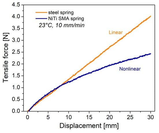 The results of tensile tests for the steel spring and the NiTi SMA spring are presented in Figure 4. A linear behavior is clearly exhibited by the steel spring, following Hooke’s law. Conversely, the NiTi SMA spring exhibits a non-linear behavior, due to the twinned martensite phase [15]. When an external force acts on the spring, the macroscopic deformation is produced by the movement of the twin limits at the martensite phase. This means that small displacements at the atomic level, when they occur in a preferential direction, generate an important change in the mechanical response. Based on the results of Figure 4, at low displacement, the stiffness K of the springs was calculated. A value of 0.135 N/mm was obtained for the steel spring, while for the NiTi SMA spring 0.160 N/mm was obtained. However, to entirely describe the mechanical response of the NiTi SMA spring, it is necessary to establish a nonlinear equation or constitutive model.