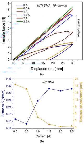 (a) Loading–unloading tests of the NiTi SMA spring at different current levels; (b) stiffness and residual displacement calculated from the loading–unloading tests.