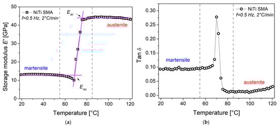 Due to its sensitivity to atomic mobility, DMA is an experimental technique that allows characterizing the dissipation or partial energy storage in materials, mainly polymers and metals, when a periodic mechanical stimulus is applied. Atomic mobility could be related to the rate at which a portion of energy has been lost or stored in the material [24,27]. Figure 6a shows the real part of the complex elastic modulus, E′, as a function of temperature, under isochronous conditions. An increase in storage modulus E′ is observed with increasing temperature, from an almost constant value of 13.3 GPa to 44.3 GPa. This increase, 3.33 times, is due to a reverse martensitic transformation, which consists of a structural rearrangement of the low-temperature phase, martensite, to the high-temperature phase, austenite. These observations are in accordance with the results in Figure 5b. Around 70 °C, a slight decrease in the modulus occurs, which is presumed to be due to the movement of dislocations or interfaces, stress relaxation, or a combination thereof [30]. From these results, the values for transformation temperatures were calculated: austenite start EAs = 69 °C and austenite finish EAf = 75.7 °C.